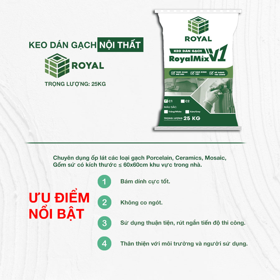 Keo dán gạch ROYALMIX V1 Tiêu chuẩn C1 là loại keo dán gạch cao cấp, đóng gói sẵn, một thành phần. Kết hợp giữa xi măng với cát chọn lọc và một số phụ gia. Chỉ yêu cầu thêm nước là sử dụng.ROYALMIX V1 là loại keo dán gạch cao cấp, đóng gói sẵn, một thành phần. Kết hợp giữa xi măng với cát chọn lọc và một số phụ gia. Chỉ yêu cầu thêm nước là sử dụng.